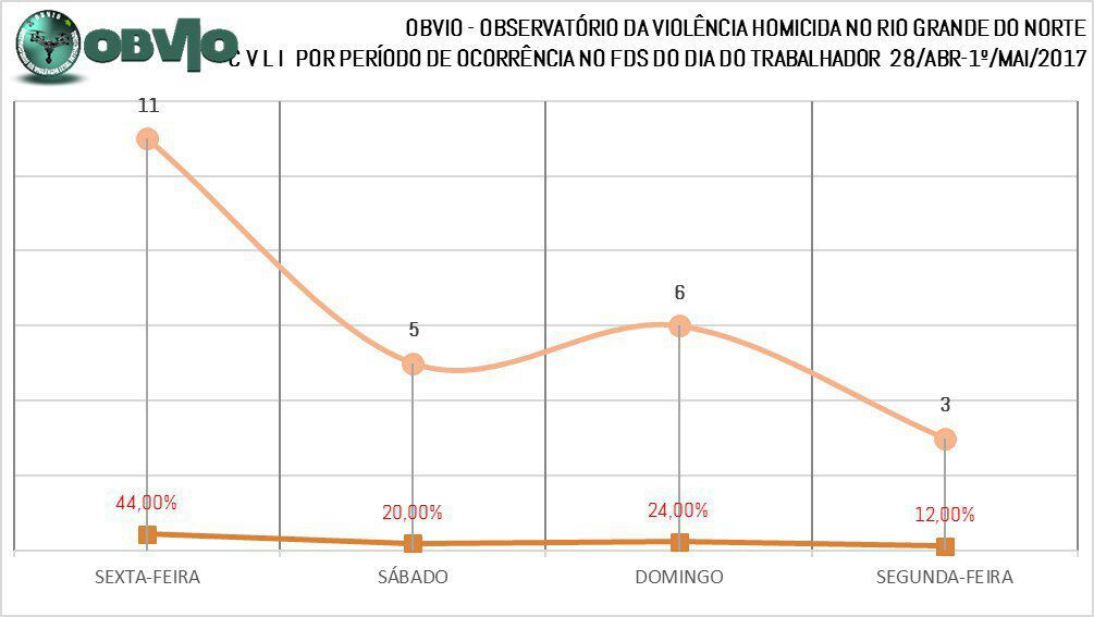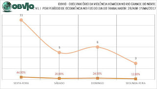Os dias mais violentos foram, respectivamente, Sexta-feira com 11 ocorrências (44% do total), seguido do Domingo, com 6 ocorrências (24% do total). O Sábado teve 5 CVLIs (20% do total), seguido do feriado do Dia do Trabalhador que foi o menos violento, com 3 CVLIs (12% do total registrado no período).
