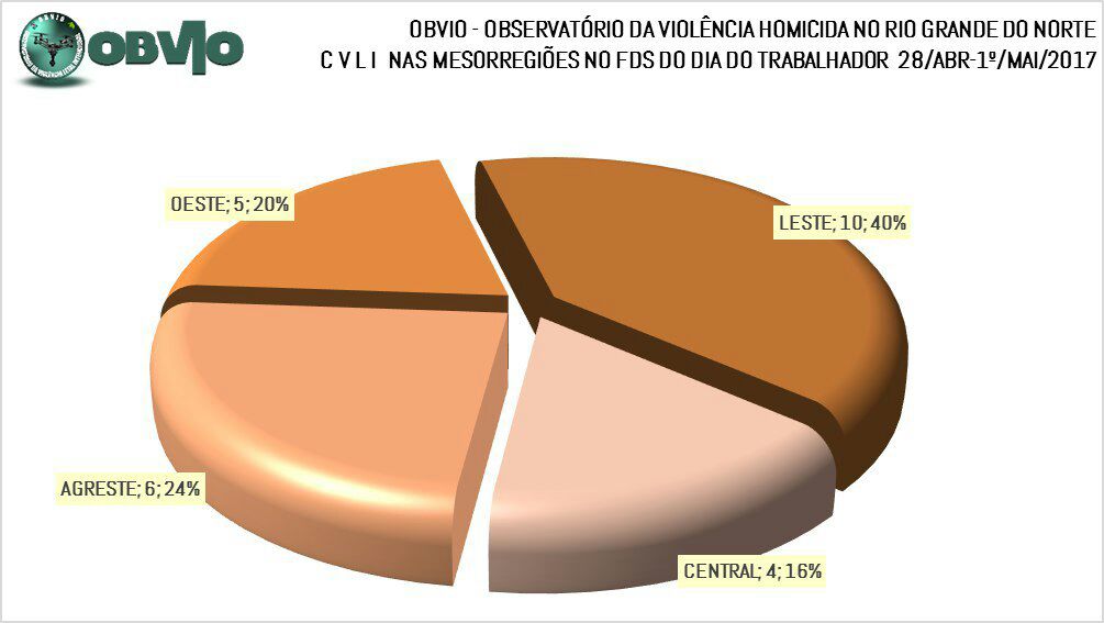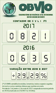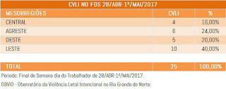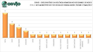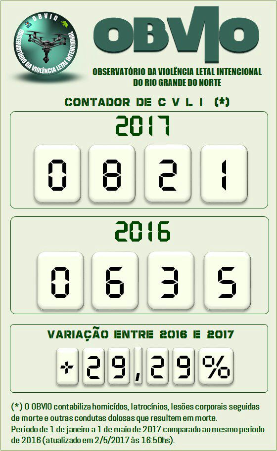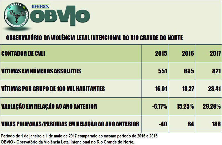 O OBVIO – Observatório da Violência Letal Intencional do RN, apresenta uma nova atualização de CVLIs, no período compreendido entre 1 de janeiro a 01 de maio de 2017 comparado ao mesmo período dos anos de 2015 e 2016.