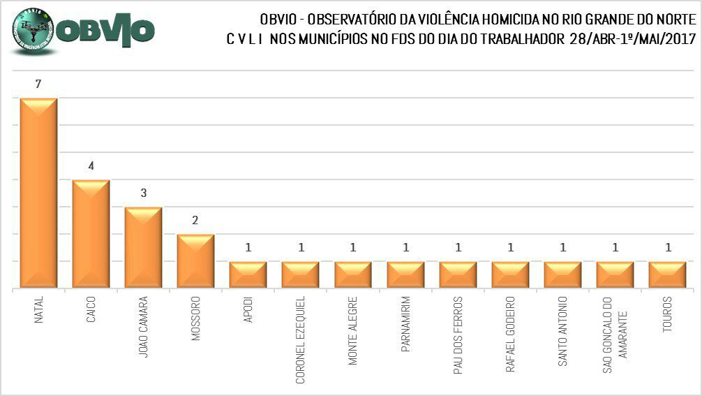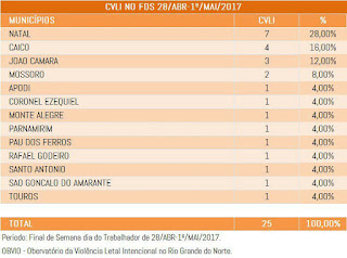 Natal liderou a violência homicida nesse final de semana com 7 CVLIs (28%), seguida de Caicó com 4 (16%). João Câmara registrou  3 CVLIs, se destacando pela alta taxa de mortes violentas nesse município (12% só neste período supracitado). Mossoró registrou 2 CVLIs (8% do total. Municípios que registraram 1 CVLI (4% cada um) cada foram: Apodi, Coronel Ezequiel, Monte Alegre, Parnamirim, Pau dos Ferros, Rafael Godeiro, Santo Antônio, São Gonçalo do Amarante e Touros.