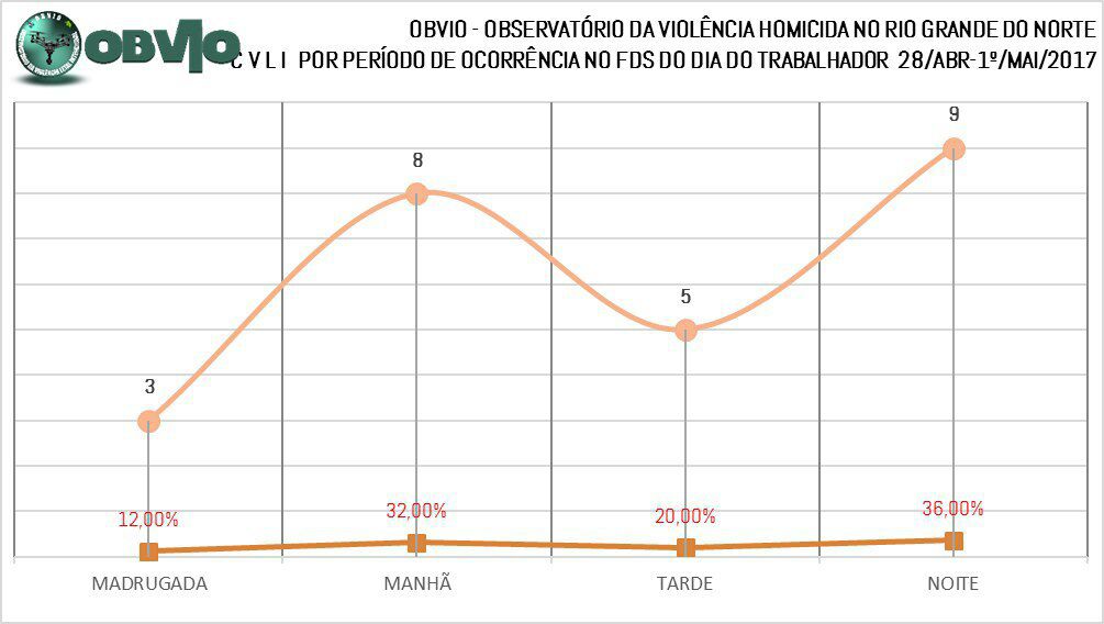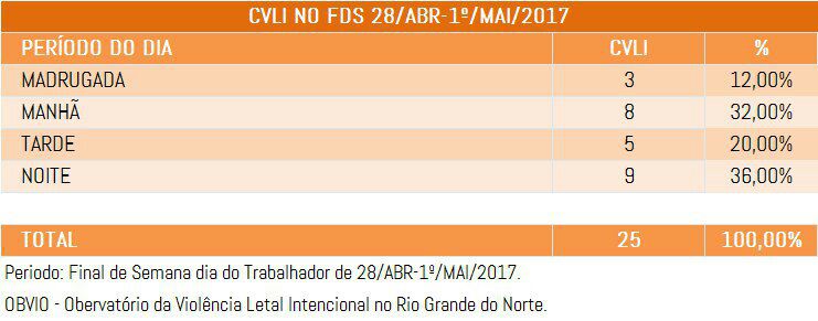Quanto aos horários em que ocorreram os CVLIs neste FDS, o horário da noite foi novamente o de maior ocorrências, com 9 CVLIs (36% do total), seguido da manhã com 8 CVLIs (32%). A tarde e a madrugada tiveram, respectivamente, 5 e 3 CVLIs em cada horário (20%  e 12% cada).
