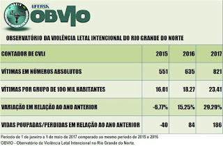O RN contabiliza mais um fim de semana violento. No cômputo geral, até o fim da noite de ontem (01/05/2017) foram 821 CVLIs no RN. Os dados apontam para um aumento de 29,29% em relação a 2016. Os dados absolutos demonstram 186 mortes violentas a mais que no ano passado no mesmo período. Em 2016, até o mesmo período, foram 635 CVLIs, contra 551 em 2015.