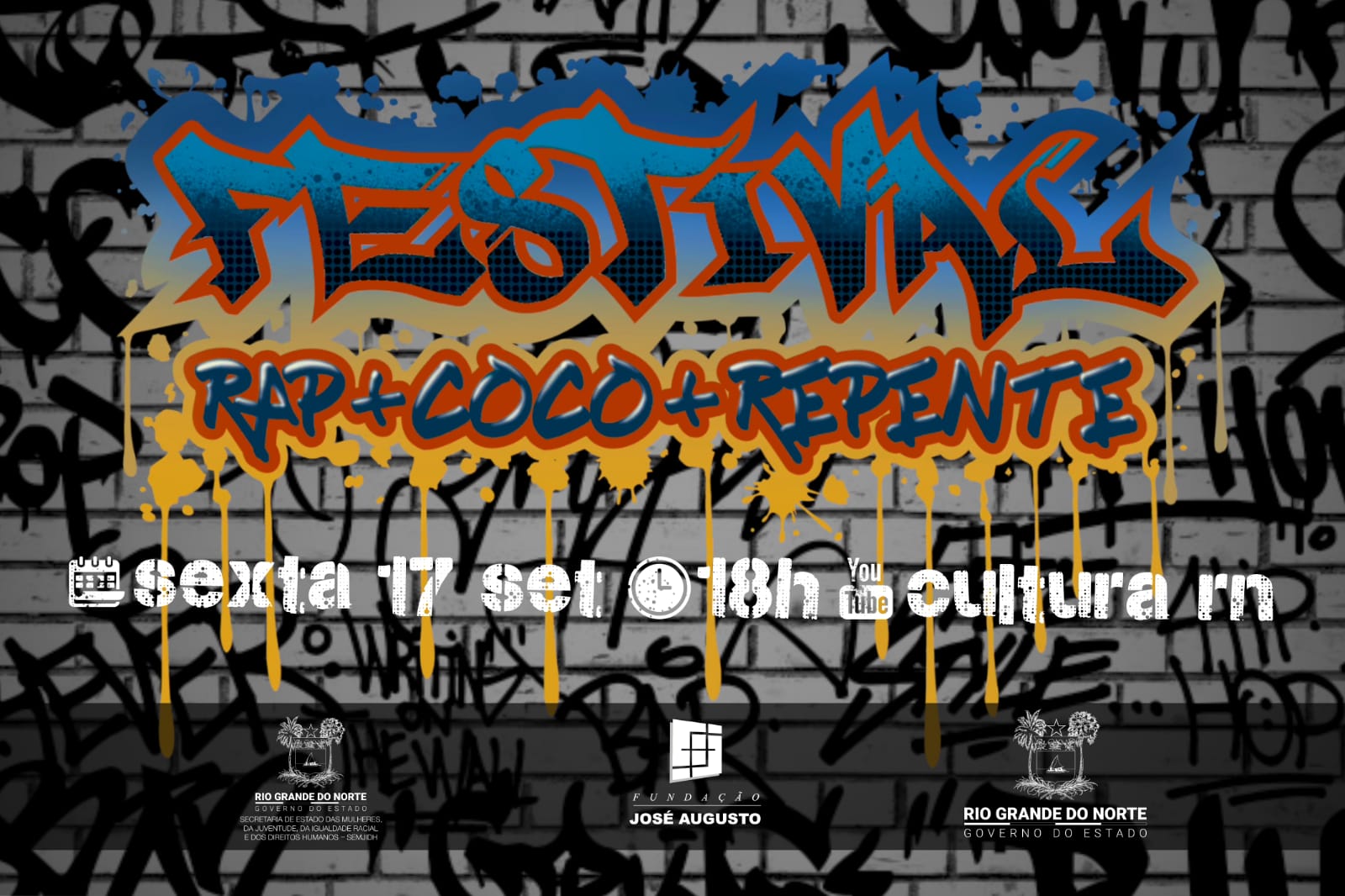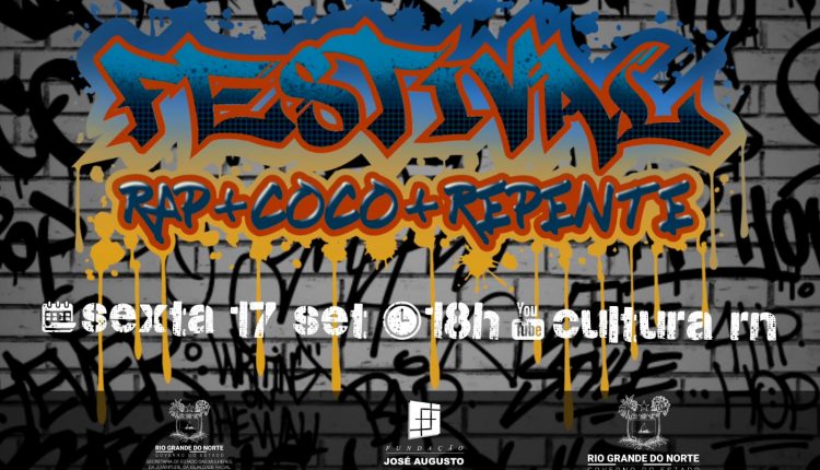Poesia rimada, grafite e dança são o foco do Festival de Rap, Coco e Repente, promovido pela Fundação José Augusto, que terá sua etapa final nesta sexta-feira (17/09) a partir das 18h em transmissão no canal do Youtube Cultura RN. O evento é promovido pela Fundação José Augusto (FJA) e Secretaria de Estado das Mulheres, da Juventude, da Igualdade Racial e dos Direitos Humanos (SEMJIDH).