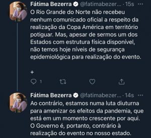 Após a escolha da Confederação Sul-americana de Futebol (Conmebol) para que o Brasil seja o país-sede da Copa América 2021 ao invés da Argentina, a governadora do Rio Grande do Norte, professora Fátima Bezerra, utilizou as suas redes sociais para comunicar que nem foi comunicada oficialmente sobre o Estado receber o campeonato e que também não aceita sediar a competição.