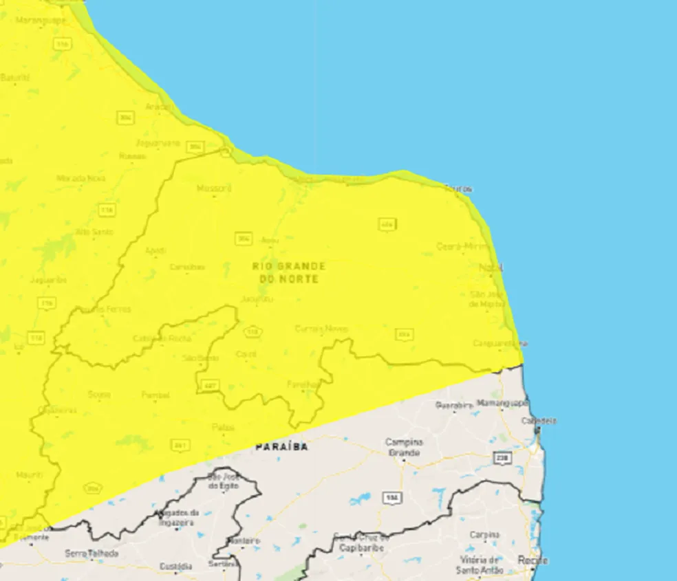 O Instituto Nacional de Meteorologia (Inmet) emitiu um alerta de chuvas intensas para todo o Rio Grande do Norte. O alerta é válido até 10h deste sábado (11).