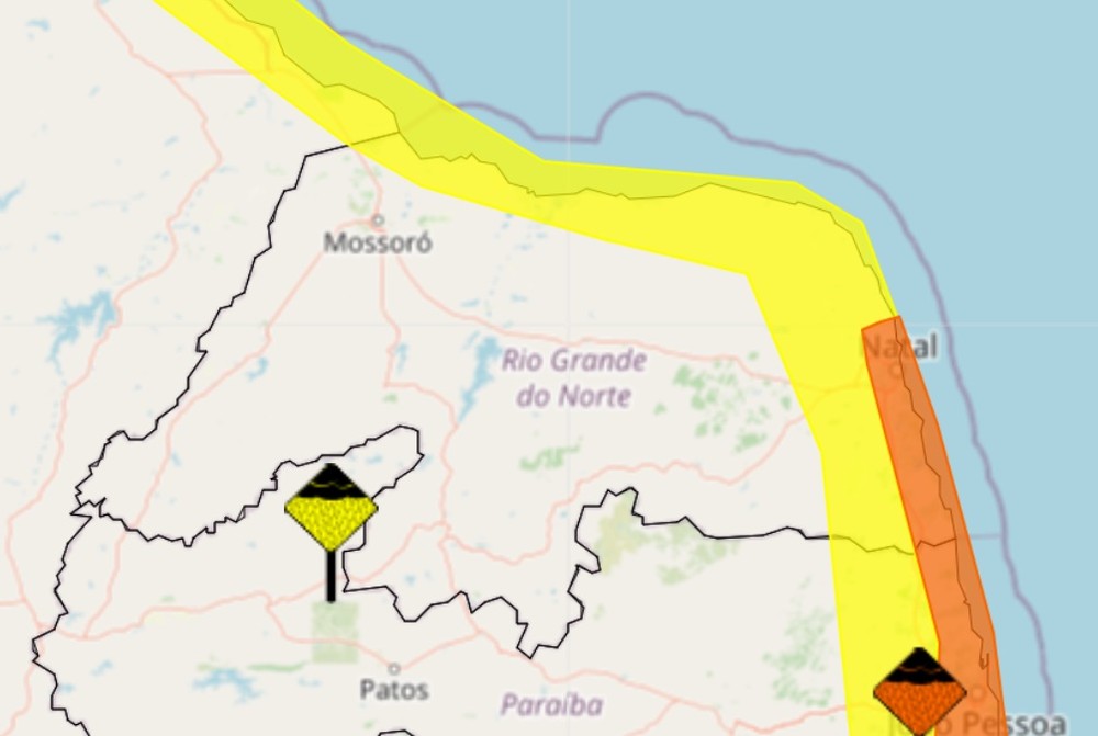O Instituto Nacional de Meteorologia (Inmet) emitiu, nesta terça-feira (28) dois alertas – um amarelo e outro laranja – de perigo e perigo potencial – por causa das chuvas no litoral do Rio Grande do Norte. Os avisos abrangem Natal e outras 68 cidades, principalmente do litoral, e valem até às 10h da quarta-feira (29).