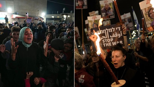 Mas mesmo antes do anúncio oficial, em meio a notícias de que o acordo havia sido fechado, centenas de pessoas saíram às ruas em Gaza para celebrar. Em Tel Aviv, imagens mostraram protestos silenciosos pedindo a volta dos reféns.