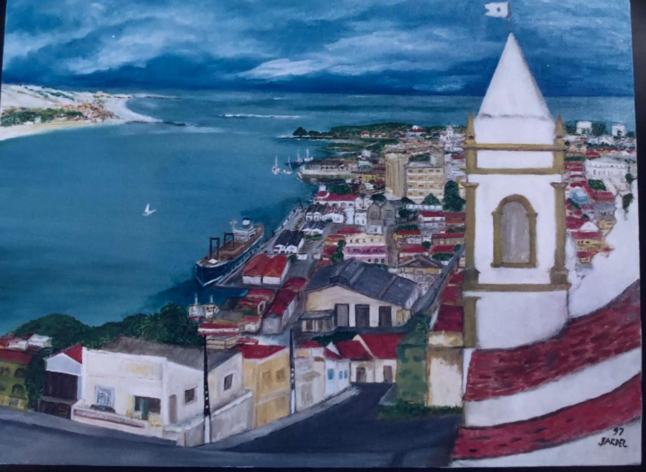 É um quadro que não retrata: consagra. A cidade aparece como um relicário de silêncio, guardando em suas formas imóveis a pulsação do que foi. O traço é contido, a composição serena. Não há ostentação. A técnica, acrílica sobre tela, opera como fio de tear invisível. O que se vê é o que permanece, mesmo depois que tudo tenha mudado. Urdir é prerrogativa de Cronos (o tempo), nunca cessa. O tempo faz e desfaz (Fiama Hasse Pais Brandão). Os pósteros que incorporem sem escrúpulos as transformações, outros lamentem o que foi desfeito e era pura beleza, como belíssimas fachadas da Ribeira. A medida desse sentimento de valorizar o que outrora foi erguido e ainda reverbera na cidade Alta – como a Igreja do Rosário dos Pretos ou a Igreja de Santo Antônio – podemos mensurar através de um olhar que procura reter as coisas belas do passado. As telas são plenas de ângulos inusitados. Há uma mirada extremamente original que contempla, lá longe, a paisagem plácida do estuário do rio Potengi. Parece que as pessoas estavam na frente da torre sineira da Igreja do Rosário dos Pretos.