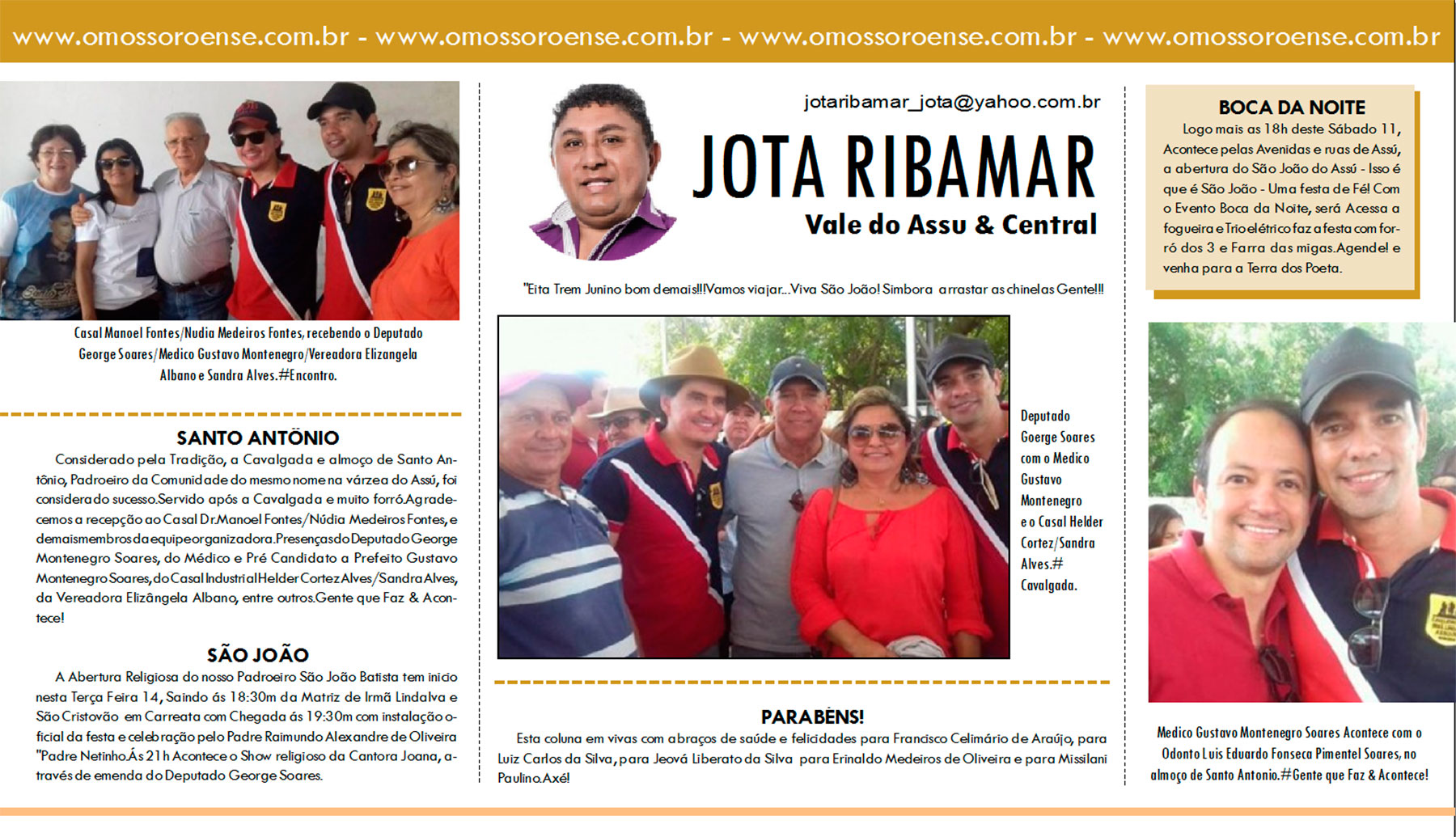 Considerado pela Tradição, a Cavalgada e almoço de Santo Antônio, Padroeiro da Comunidade do mesmo nome na várzea do Assú, foi considerado sucesso.Servido após a Cavalgada e muito forró.Agradecemos a recepção ao Casal Dr.Manoel Fontes/Núdia Medeiros Fontes, e demais membros da equipe organizadora.Presenças do Deputado George Montenegro Soares, do Médico e Pré Candidato a Prefeito Gustavo Montenegro Soares, do Casal Industrial Helder Cortez Alves/Sandra Alves, da Vereadora Elizângela Albano, entre outros.Gente que Faz & Acontece!