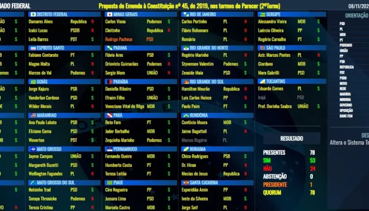 Foram 53 votos favoráveis, apenas quatro votos a mais do exigido para a aprovação. Teve votos favoráveis o do PT, PSB PSB, MDB, PDT e União Brasil e contrários do PL, PP e Republicanos. O ex-presidente Jair Bolsonaro pode ser considerado derrotado pelo fato de haver participado da mobilização para derrubar o projeto da reforma.