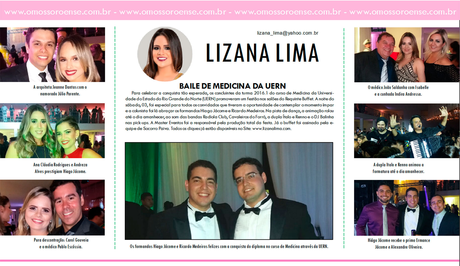 Para celebrar a conquista tão esperada, os concluintes da turma 2016.1 do curso de Medicina da Universidade do Estado do Rio Grande do Norte (UERN) promoveram um festão nos salões do Requinte Buffet. A noite do sábado, 03, foi especial para todos os convidados que tiveram a oportunidade de contemplar o momento ímpar e a colunista foi lá abraçar os formandos Hiago Jácome e Ricardo Medeiros. Na pista de dança, a animação rolou até o dia amanhecer, ao som das bandas Radiola Club, Cavaleiros do Forró, a dupla Ítalo e Renno e o DJ Balinha nas pick-ups. A Master Eventos foi a responsável pela produção total da festa. Já o buffet foi assinado pela equipe de Socorro Paiva. Todos os cliques já estão disponíveis no Site: www.lizanalima.com.