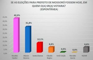 Nela, diferente dos números da pesquisa TS2/TCM divulgados na noite de quinta-feira (12), a prefeita de Mossoró, Rosalba Ciarlini (PP), está levando vantagem sobre o agora segundo colocado, deputado Alysson Bezerra (Solidariedade).
