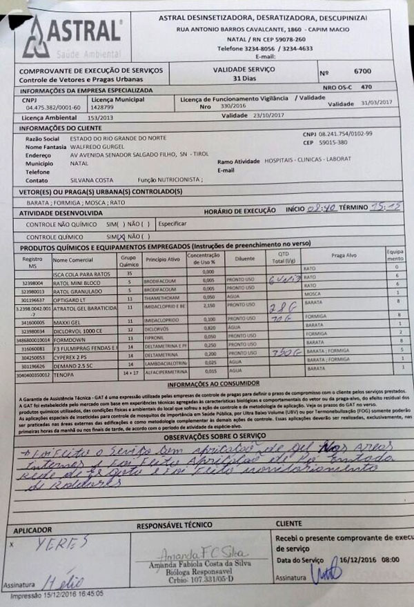 Confira o comprovante da última dedetização realizada no Hospital Walfredo Gurgel: