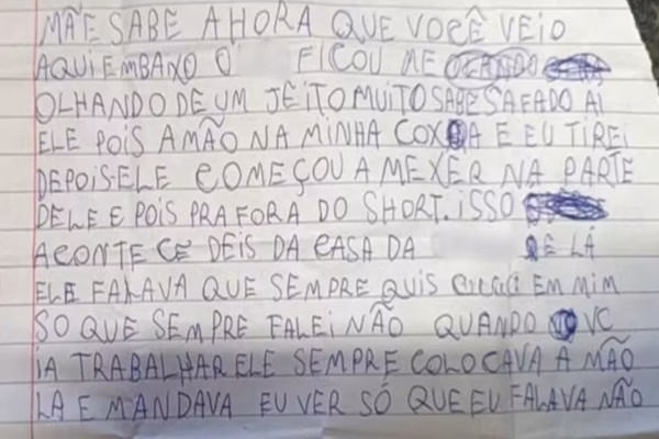 Na carta, a menina escreveu: ”Ele colocou a mão dentro da minha coxa, e eu tirei. Depois, ele começou a mexer na parte dele e pôs para fora do short”.