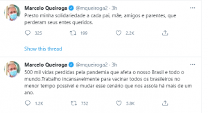 Em sua conta no Twitter, Queiroga diz prestar solidariedade a cada pai, mãe, amigos e parentes, que perderam seus entes queridos. “500 mil vidas perdidas pela pandemia que afeta o nosso Brasil e todo o mundo. Trabalho incansavelmente para vacinar todos os brasileiros no menor tempo possível e mudar esse cenário que nos assola há mais de um ano”, disse o ministro.