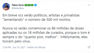 Diferentemente de Marcelo Queiroga, o ministro das Comunicações, Fábio Faria, fez uma postagem polêmica no Twitter. Disse ele: “Em breve vcs verão políticos, artistas e jornalistas ‘lamentando’ o número de 500 mil mortos. Nunca os verão comemorar os 86 milhões de doses aplicadas ou os 18 milhões de curados, porque o tom é sempre o do ‘quanto pior, melhor’. Infelizmente, eles torcem pelo vírus”.