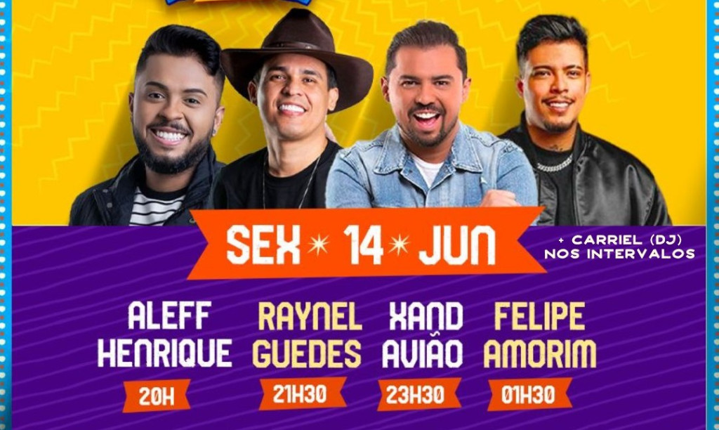 Na antiga estação ferroviária de Mossoró, a noite desta sexta-feira (14) é comandada por Xand, Felipe Amorim, Raynel Guedes e Aleff Henrique. A programação segue no Polo Cidadela com Crys Saraiva, Renata Falcão, Dani Rebouças, Ray Filho e o Forró Xodó Nordestino. A festa conta ainda com o Festival Independente de Quadrilhas Juninas, na Arena Deodete Dias, e com atrações nos polos Antônio Francisco, Igreja de São João, Circo do Forró e Anima Chuva.