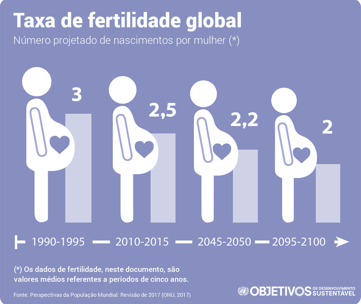 Essa tendência surge apesar das baixas taxas de fertilidade em quase todas as regiões do mundo, incluindo a África, onde as taxas caíram de 5,1 nascimentos por mulher de 2000 a 2005 a 4,7 nascimentos de 2010 a 2015.