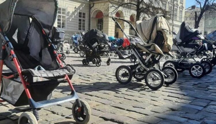 Os habirtantes da cidade tiveram a ideia de colocar carrinhos e cadeiras de bebé na praça central da cidade.