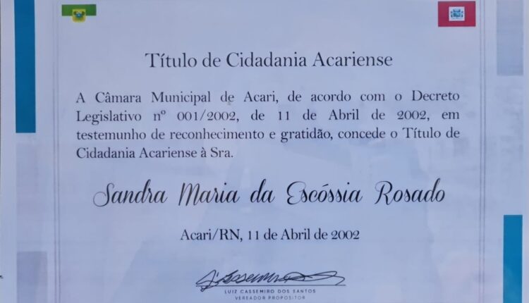 A ex-deputada Sandra Rosado esteve, ontem, em Acari, onde recebeu o titulo de cidadania que lhe foi conferido pela Câmara Municipal de Vereadores da cidade. A homenagem foi proposição do vereador Luis Cassimiro dos Santos.