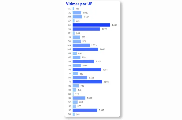 Em números absolutos, os estados onde mais foram registrados assassinatos em 2024 são Bahia (4.480); Rio de Janeiro (3.504); Pernambuco (3.381); Ceará (3.272); Minas Gerais (3.042); São Paulo (2.937), Pará (2.570) e Maranhão (2.053). Roraima e Acre registraram, respectivamente, 119 e 168 assassinatos, sendo as unidades federativas com os menores números de vítimas de crimes violentos contra a vida.