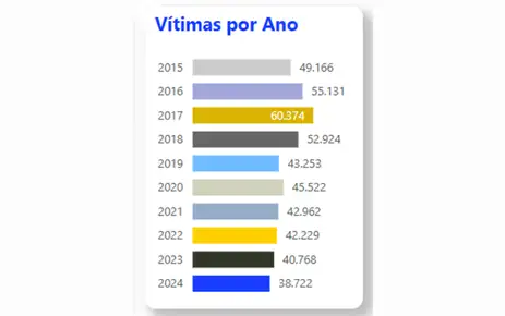 Nacionalmente, o número de pessoas assassinadas a cada grupo de 100 mil habitantes baixou de 19,26, em 2023, para 18,21, em 2024. Em 2017, ano em que os órgãos públicos oficiais reportaram o maior número de assassinatos (60.374) dos últimos dez anos, esta mesma taxa foi de 29,42.