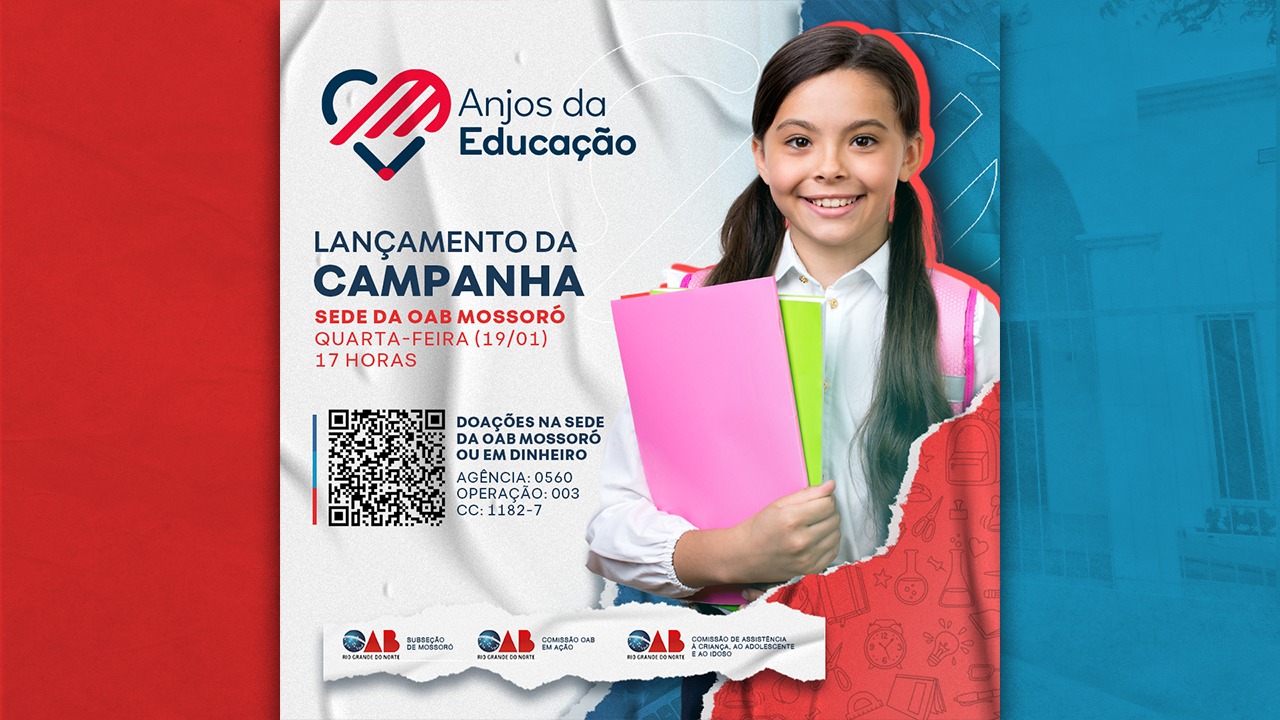Através das Comissões OAB em Ação e de Apoio à Criança, ao Adolescente e ao Idoso, a OAB Mossoró lançará na próxima quarta-feira, 18, às 17 horas, a Campanha Solidária Anjos da Educação, cujo objetivo é arrecadar material escolar e doações para estudantes da educação infantil de Mossoró.