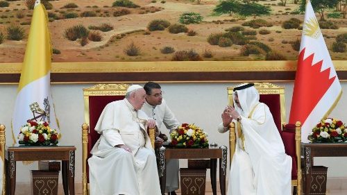 O logotipo da viagem foi formado pelas bandeiras do Reino do Bahrein e da Santa Sé, representadas de forma estilizada como duas mãos abertas para Deus, simbolizando também o compromisso dos povos e nações de se encontrarem num espírito de abertura, sem preconceitos, como “irmãos e irmãs”. O fruto do encontro fraterno foi o dom da paz, simbolizado pelo ramo de oliveira representado no centro das “duas mãos”.