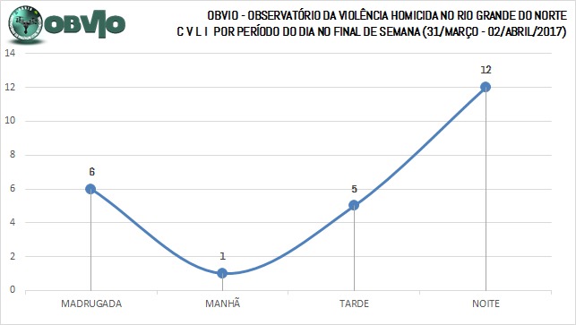 Quanto aos horários em que ocorreram os CVLIs neste FDS, o horário da noite foi novamente o de maior ocorrências, com 12 CVLIs, seguido da madrugada com 6 CVLIs, da tarde com 5CVLIs e da manhã com 1 CVLI.