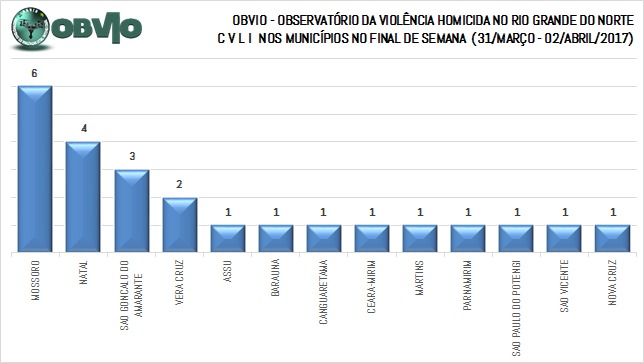 Mossoró, Natal e municípios da Região Metropolitana capitanearam quase que absolutamente a violência homicida nesse final de semana. Mossoró segue no topo com 6 CVLIs, seguido de Natal com 4, São Gonçalo do Amarante com 3 e Vera Cruz com 2 ocorrências. Municípios que registraram 1 CVLI cada foram: Assú, Baraúna, Canguaretama, Martins, Parnamirim, São Paulo do Potengi, São Vicente e Nova Cruz.