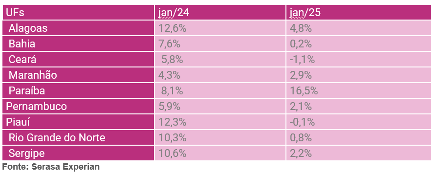 São Paulo, 27 de março de 2025 – Em janeiro, no Nordeste do país, apenas a Paraíba apresentou crescimento na demanda dos brasileiros por crédito, segundo dados do Indicador de Demanda dos Consumidores por Crédito da Serasa Experian, primeira e maior datatech do Brasil. A alta foi de 8,4 pontos percentuais (p.p.), passando de 8,1% em janeiro de 2024 para 16,5% no mesmo mês deste ano. O recuo mais acentuado foi observado no Piauí, com uma redução de 12,4 p.p., indo de 12,3% para -0,1%. Veja as informações estaduais da região na tabela a seguir: