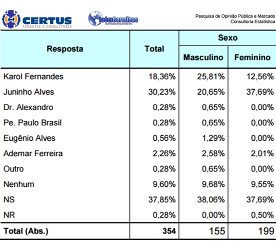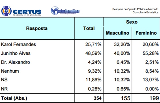 O Instituto CERTUS divulgou a primeira pesquisa de opinião pública sobre as intenções de voto nas eleições municipais deste ano no município de Caraúbas, no Oeste potiguar. O levantamento, feito em parceria com o blog Icém Caraúbas, mostrou que o pré-candidato Juninho Alves (PSD) está na liderança na corrida à prefeitura do município com 48,59% das intenções de votos na pesquisa estimulada.