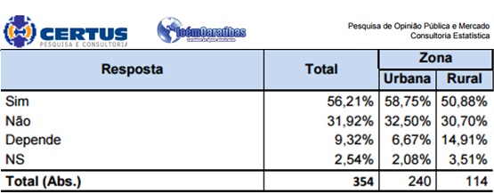 Quando perguntados “O(a) Sr(a) votaria em um candidato para prefeito de Caraúbas que fosse apoiado por Eugênio Alves?”, os eleitores caraubenses se dividiram da seguinte forma: