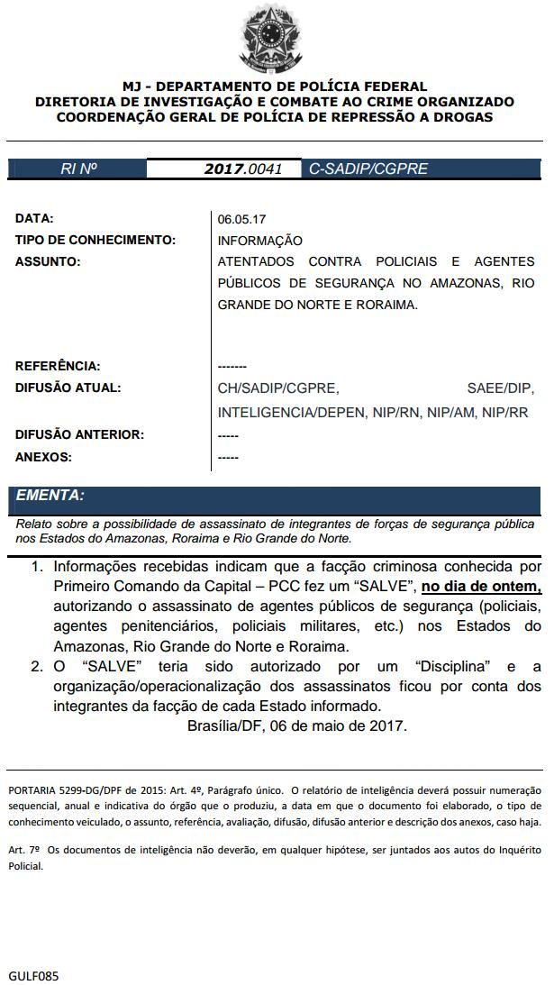 De acordo como documento da Diretoria de Investigação e Combate ao Crime Organizado e da Coordenação Geral de Polícia de Repressão a Drogas, o PCC fez um “salve” no dia 05 de maio autorizando o assassinato de policiais, agentes penitenciários e policiais militares.