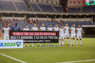 O time mossoroense Potiguar fez um protesto no último sábado (1), quando jogou contra o América, na Arena das Dunas, em Natal. Os jogadores exibiram uma faixa com a frase: