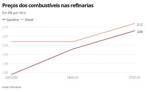 A partir desta quarta-feira (27), o preço da gasolina da Petrobras nas refinarias subirá pela segunda vez em menos de dez dias. De acordo com a estatal, o reajuste será de 5%, para um valor médio de R$ 2,08 por litro. No primeiro reajuste do ano, realizado semana passada, o combustível sofreu alta de 7,6%. O preço do diesel também será reajustado, em 4,4% para R$ 2,12 o litro.