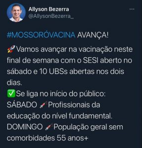 O prefeito Alysson Bezerra anunciou em suas redes sociais que Mossoró irá vacinar neste final de semana pessoas na faixa etária de 55 amos acima sem comorbidades e profissionais da Educação do Ensino Fundamental. A vacinação acontecerá no ginásio do Sesi e em dez Unidades Básicas de Saúde (UBS) neste sábado (05) e domingo (06).