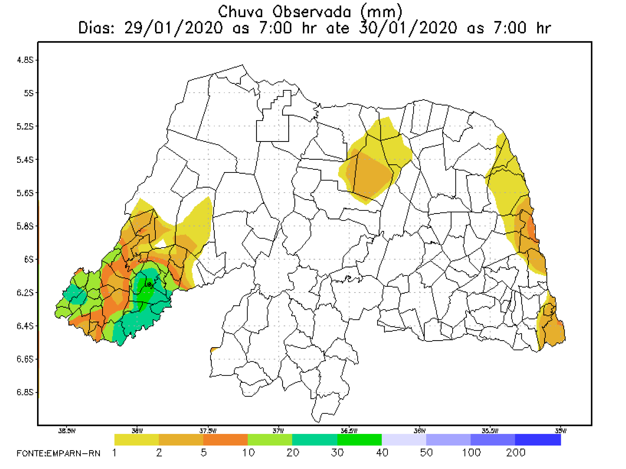 O boletim pluviométrico da EMPARN registrou a ocorrência de chuvas em 66 postos de monitoramento instalados pelo RN de sexta-feira (01) até a manhã de hoje (04/05), às 07h da manhã. As chuvas aconteceram em todas as regiões do estado com maiores volumes acumulados no período no Oeste em Upanema com 46,4 milímetros (mm), Antônio Martins 42 mm e João Dias 40,1 mm. Em Mossoró choveu 24,4mm.