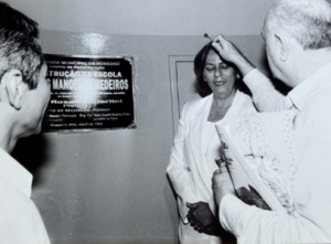 Padre Sátiro Dantas dando a benção no prédio da Escola Municipal Alcides Manoel de Medeiros, no bairro Redenção, também se fez presente a Prefeita Rosalba Ciarlini – 1999.