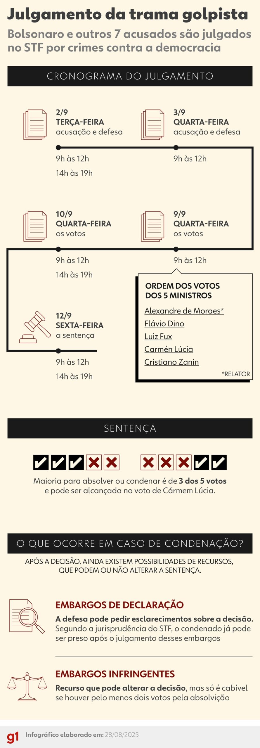 O Supremo Tribunal Federal (STF) começa a julgar Jair Bolsonaro (PL) e outros sete réus por tentativa de golpe no dia 2 de setembro. As sessões vão acontecer ao longo de duas semanas.