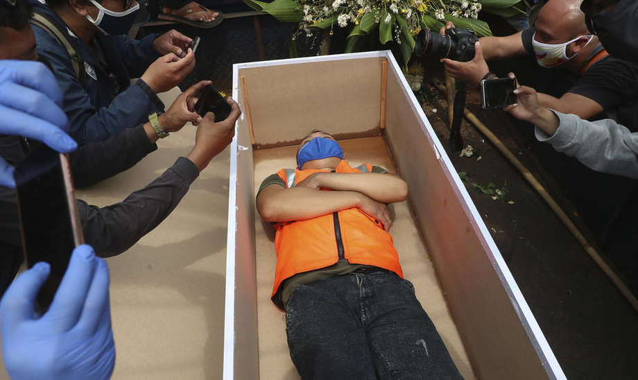 Homem deita em caixão nas ruas de Jacarta como punição por não usar máscara – (Foto: Achmad Ibrahim/AP)