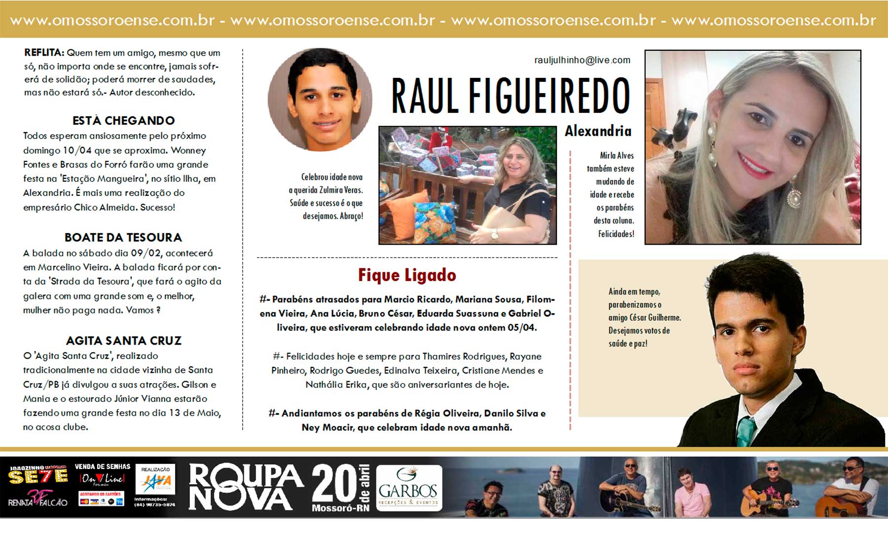 #- Andiantamos os parabéns de Régia Oliveira, Danilo Silva e Ney Moacir, que celebram idade nova amanhã.