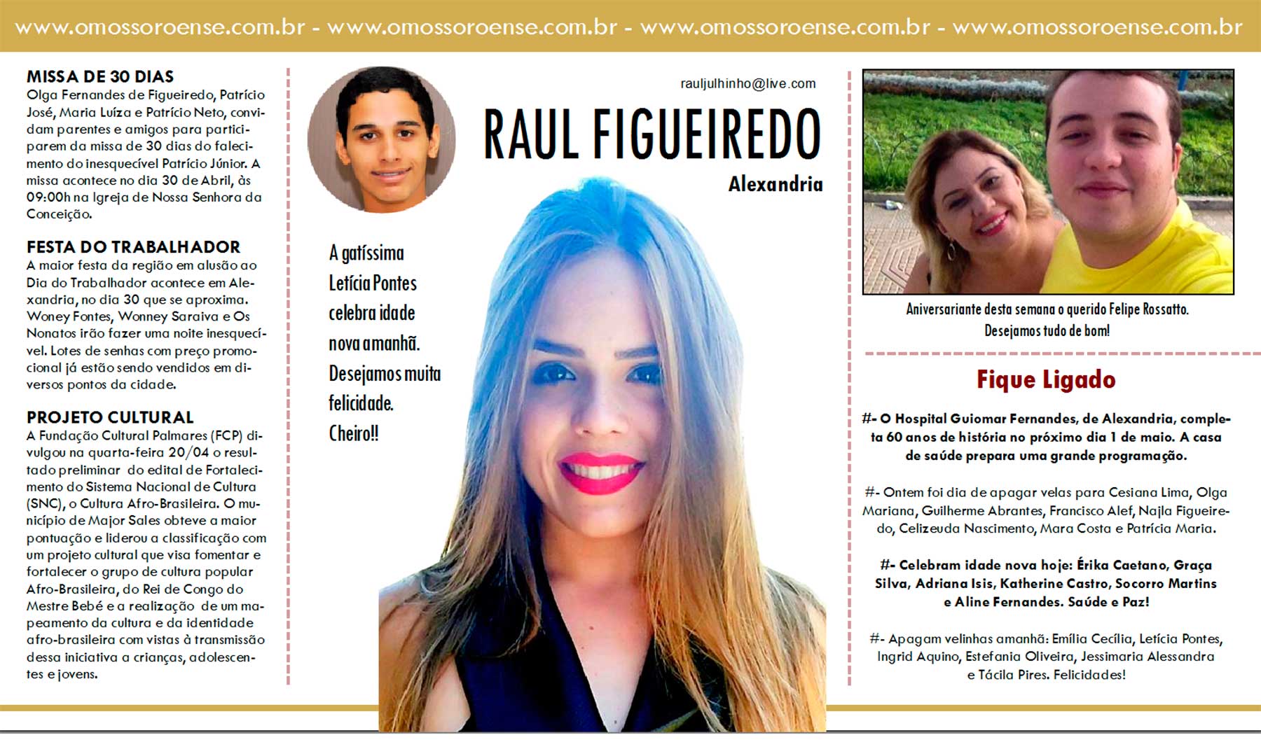 A maior festa da região em alusão ao Dia do Trabalhador acontece em Alexandria, no dia 30 que se aproxima. Woney Fontes, Wonney Saraiva e Os Nonatos irão fazer uma noite inesquecível. Lotes de senhas com preço promocional já estão sendo vendidos em diversos pontos da cidade.