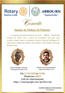 O nosso querido confrade Antônio Filemom, tomará posse como imortal da ABROL nesta sexta feira, 12.05.23 às 19h 30min, vamos estar presente online. Parabéns, irmão.