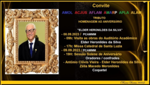 AMOL – ACJUS – AFLAM – AMARP – APLA – ALAM – unidas estão promovendo um grande TRIBUTO em homenagem ao mestre ELDER HERONILDES DA SILVA, pela Passagem dos seus 90 anos. A Programação será na seguinte ordem: Dia 08.09.23 – partir das 9h – visitação as obras do auditório acadêmico Elder Heronildes da Silva – PCAMMM (sede da ACJUS, AMOL e AMARP). No mesmo dia 08.09.23 – 17h missa na Catedral de Santa Luzia. Agora no dia 09.09.2023 – 19h – Sessão Solene de aniversário, sendo oradores os Confrades Antônio Clóvis Vieira, Elder Heronildes da Silva e Zélia Macedo Heronildes. Lancamento do Livro Elder Heronildes, Um Presidente de Honra, Anotações para a História. Após teremos um coquetel patrocinado pelo aniversariante. Dr. ELDER HERONILDES DA SILVA, estará bem melhor com a presença dos confrades e confreiras. Estamos juntos nessa gratidão!