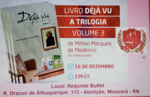 Mossoró teve a oportunidade de acrescentar a sua história cultural e social mais um acontecimento daqueles que nós relacionamos como histórico. Estamos falando do lançamento de mais um bloco da trilogia Déjà Vu, obra literária de grande significado sociológico, filosófico, jornalística e histórico, posto que fora construída ao longo de quase duas décadas pelo nosso imortal Milton Marques de Medeiros. Obra essa atemporal, dada que muitas dessas reflexões selecionadas para o Déjà vu ainda estão na ordem do dia do povo mossoroense, potiguar e brasileiro, numa demonstração global que o autor tinha do mundo passado, presente e que viria no futuro.
