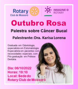 O Rotary vem atuando e criando diversas campanhas de alerta contra o câncer de mama em toda região de Mossoró. Junto a comissão permanente de projeto Rotary, a campanha vem tomando corpo e ação. Dentro desta campanha existe uma lição de alerta, que diz: Mas hoje, o seu amor vem através do autoexame! Aproveite o Outubro Rosa para se proteger do câncer de mama!” “Seu corpo é seu abrigo, por isso não deixe de cuidar dele com muito amor. Faça o autoexame e previna-se contra o câncer de mama no Outubro Rosa.”
