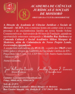 Dia 05.11.22 – 19h – Sessão Solene Comemorativa aos 8 anos de Nossa fundação com a entrega da medalha Ruy Barbosa e da Comenda Cultural e Social Acadêmico MILTON MARQUES DE MEDEIROS, além da certificação da Escola Padre Sátiro Cavalcanti Dantas pela execução do Projeto Lendo, Escrevendo e Aprendendo.