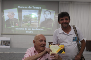 Padre Sátiro entregando o certificação de participação na ACJUS do amigo Ênio, o mito.
