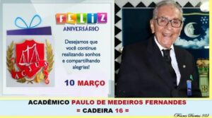 Todos os vivas vão para o nosso irmão e amigo, professor Dr. Paulo de Medeiros Fernandes, que apagou mais uma velinha no dia 10 de março. Parabéns.