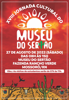 XVIII jornada cultural do museu do sertão ocorrerá no 27 de agosto de 2022, que é um sábado, de 8h às 15 horas. O evento ocorrerá no Salão de Eventos do Museu do Sertão, ou seja, na Fazenda Rancho Verde, que fica na Estrada da Alagoinha, a 4 quilômetros de Mossoró. Vamos prestigiar a festa.